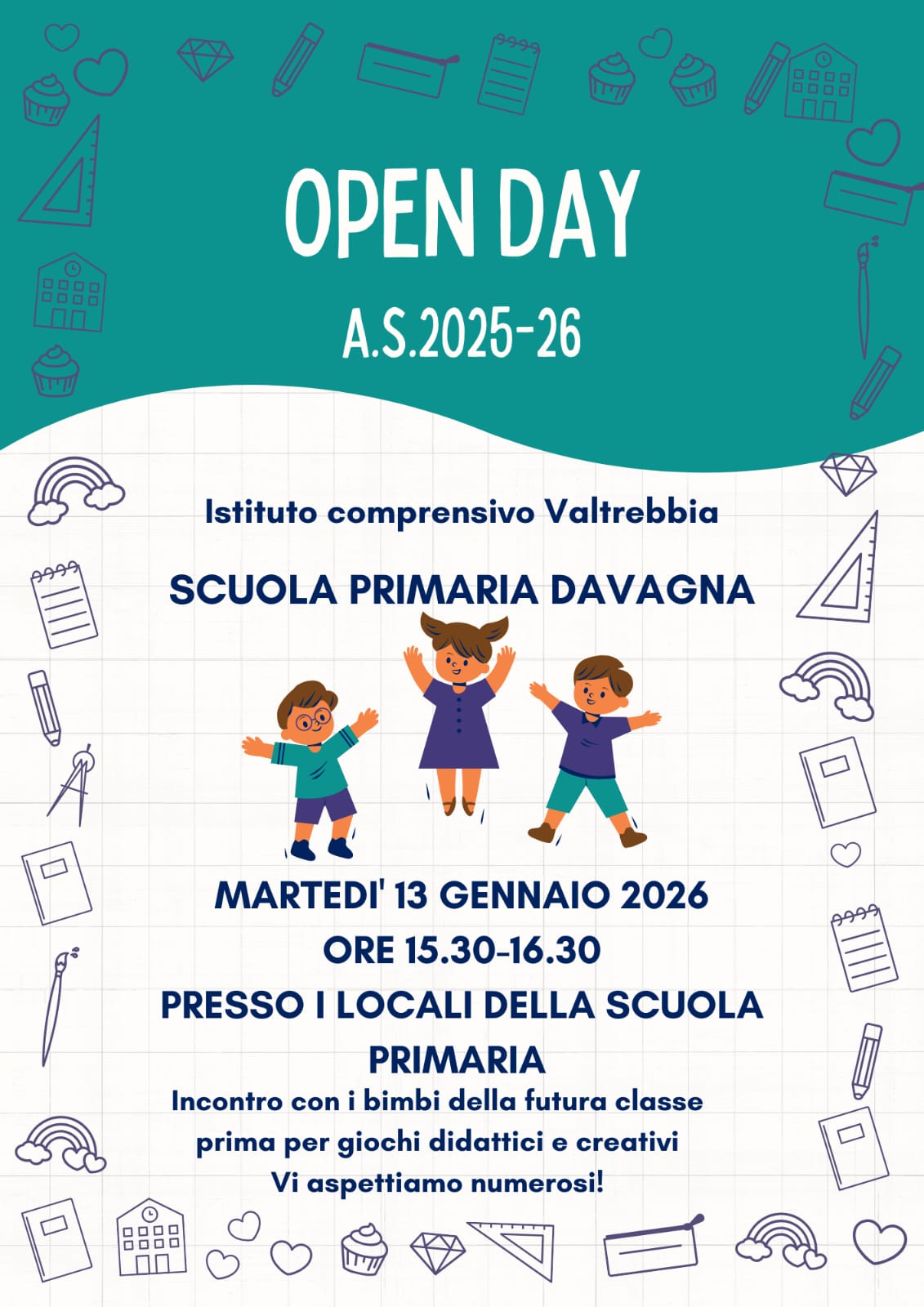 Descrizione Giornata dedicata ai nostri bimbi che vorranno frequentare la nostra scuola primaria. Vi aspettiamo numerosi.